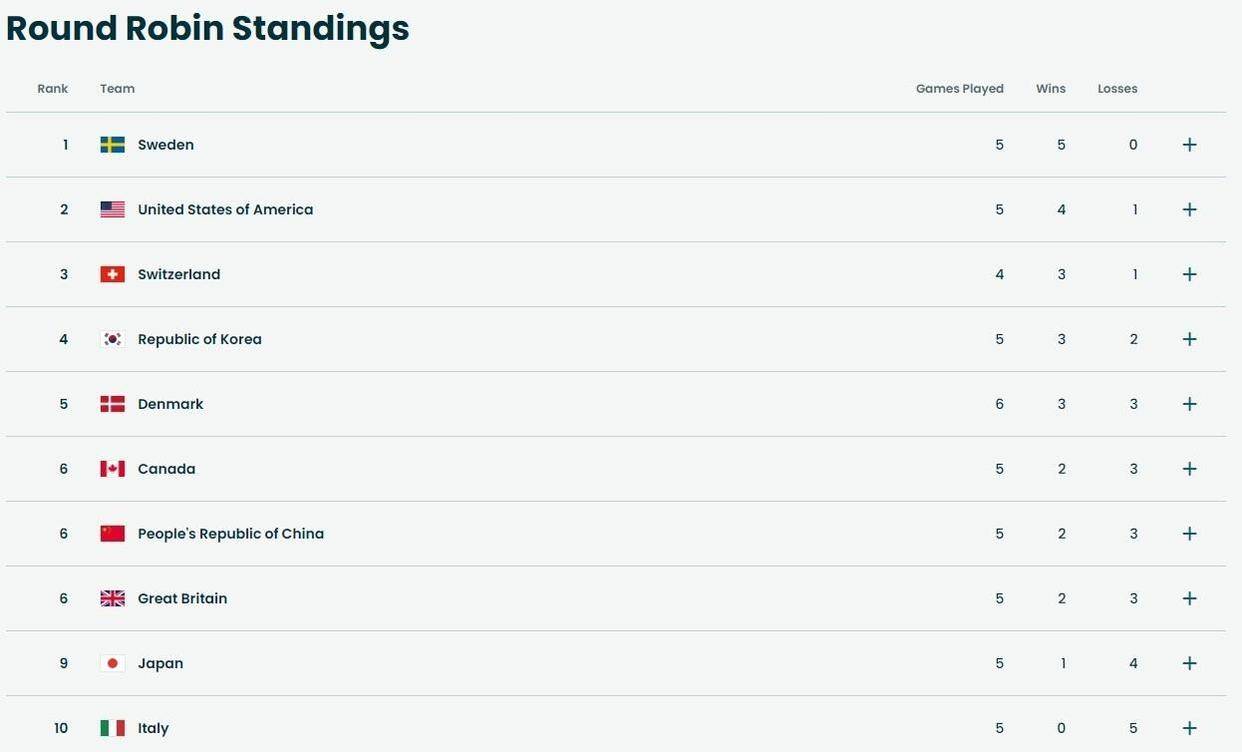 另一场比赛在英国队和丹麦队之间进行。 英国队从开局就掌握了主动权,第二局后手拿到2分,第四局再拿3分,半场就建立了5-1的领先优势。 丹麦队在先手机会中未能有效限制英国队得分,仅在第七局后手艰难拿到1分。 最终,英国队以7-2大胜丹麦队,同样将自己的战绩提升到2胜3负。